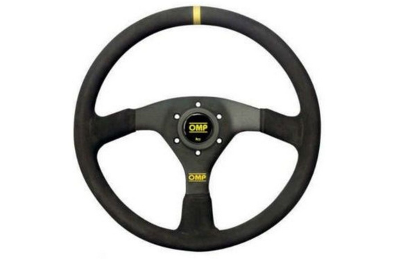 Kierownica zamszowa OMP VELOCITA – czarna z czarnym obszyciem, płaska.
