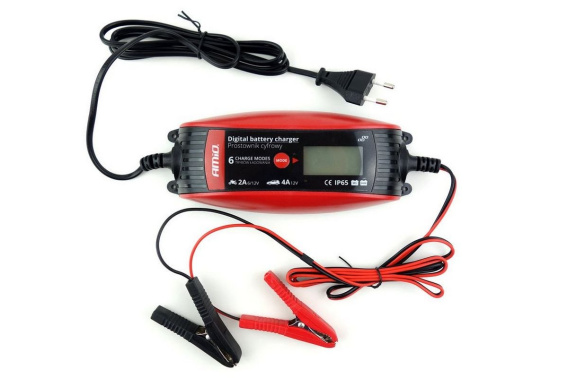 Prostownik DBC-4A firmy Amio. Można nim ładować akumulatory kwasowo-ołowiowe (zwykłe oraz MF), Ca/Ca, AGM i żelowe. Jest to prostownik mikroprocesorowy, wykonany zgodnie z normą IP65, co oznacza odporność na pył i zachlapanie oraz oblanie strumieniem wody o niskim ciśnieniu. Na bieżąco pokazuje napięcie akumulatora i stopień naładowania oraz reguluje prąd ładowania w zależności od jego potrzeb. Po naładowaniu wyświetla komunikat FULL i podtrzymuje napięcie na akumulatorze.