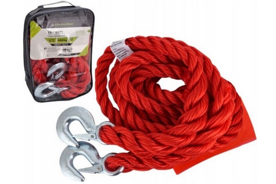 Wytrzymała, pleciona linka holownicza zakończona hakami.