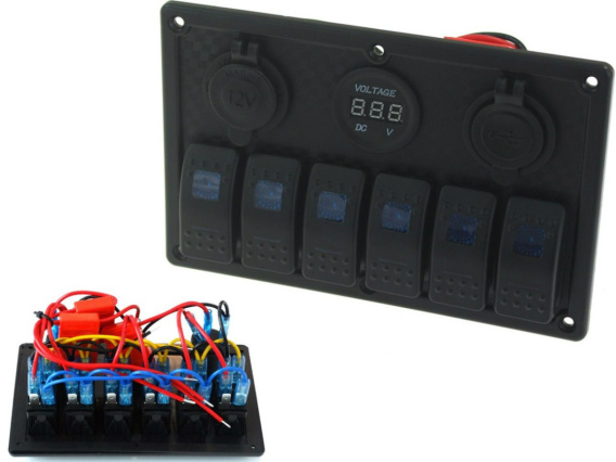 Panel przełączników ON-OFF x 5 + gniazdo zapalniczki + 2 gniazda USB 3.1A + 2 bezpieczniki 15A