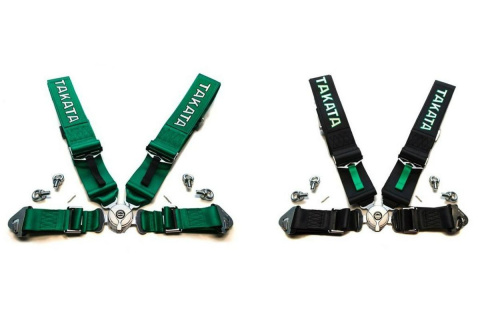 Rajdowe homologowane 4-punktowe pasy bezpieczeństwa tuningowe firmy Takata. Mocowane za pomocą karabińczyków i śrub oczkowych, posiadają centralnie rozpinaną klamrę.