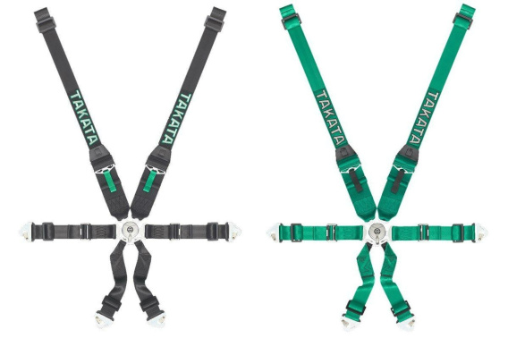 Rajdowe homologowane 6-punktowe pasy bezpieczeństwa tuningowe firmy Takata. Mocowane za pomocą karabińczyków i śrub oczkowych, posiadają centralnie rozpinaną klamrę.