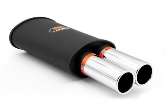 Uniwersalny tłumik sportowy firmy RM Motors oparty na aluminiowanej konstrukcji puszki, końcówki tłumika wykonane są z polerowanej blachy kwasoodpornej. Można z powodzeniem stosować w większości samochodów, także w dieslach. Pięknie podkreśla pracę silnika, nie będąc przy tym uciążliwym podczas dłuższej jazdy. Każdy element produktu wykonany w technologii CNC.