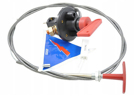 Główny wyłącznik prądu (hebel) 6-biegunowy 12V / 500 Amp zgodny z wymogami FIA + linka. Producent to renomowana marka RRS. W zależności od dostawy kolor osłony linki może mieć kolor srebrny bądź czarny.